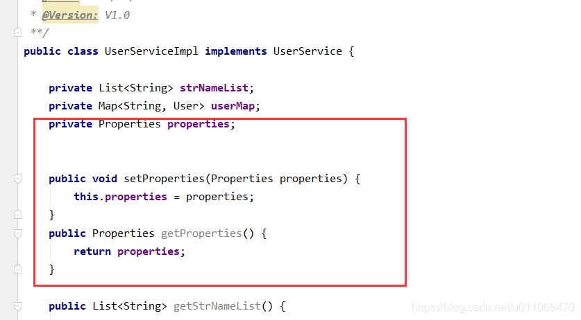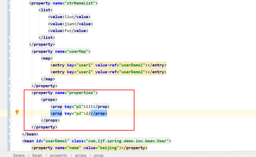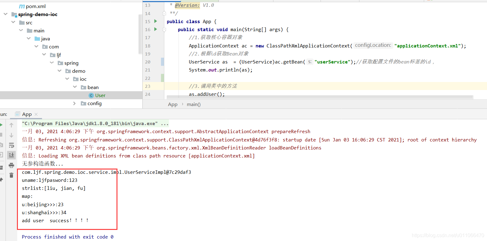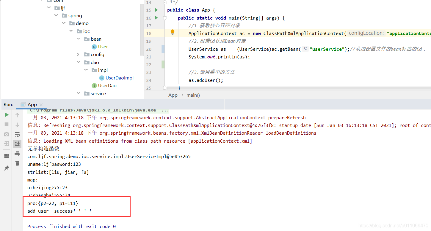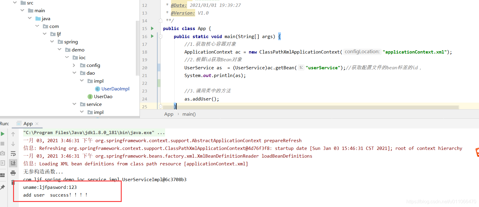 package com.ljf.spring.demo.ioc.service.impl;import com.ljf.spring.demo.ioc.bean.User;import com.ljf.spring.demo.ioc.dao.UserDao;import com.ljf.spring.demo.ioc.service.UserService;import java.util.List;import java.util.Map;/** * @ClassName: UserServiceImpl * @Description: TODO * @Author: liujianfu * @Date: 2021/01/03 11:19:57 * @Version: V1.0 **/public class UserServiceImpl implements UserService { private List strNameList; private Map userMap; public List getStrNameList() { return strNameList; } public void setStrNameList(List strNameList) { this.strNameList = strNameList; } public Map getUserMap() { return userMap; } public void setUserMap(Map userMap) { this.userMap = userMap; } private String userName; private String password; public void setUserName(String userName) { this.userName = userName; } public void setPassword(String password) { this.password = password; } private UserDao ud; //有参数构造函数 public UserServiceImpl(UserDao ud) { this.ud = ud; } //无参构造函数 public UserServiceImpl() { } /** public void setUd(UserDao ud) { this.ud = ud; } **/ public int addUser() { System.out.println("uname:"+userName+"pasword:"+password); System.out.println("strlist:"+strNameList.toString()); System.out.println("map:"); for(String key:userMap.keySet()){ System.out.println("u:"+userMap.get(key).getName()+">>>:"+userMap.get(key).getAge()); } return ud.addUser(); }} 3.调用: